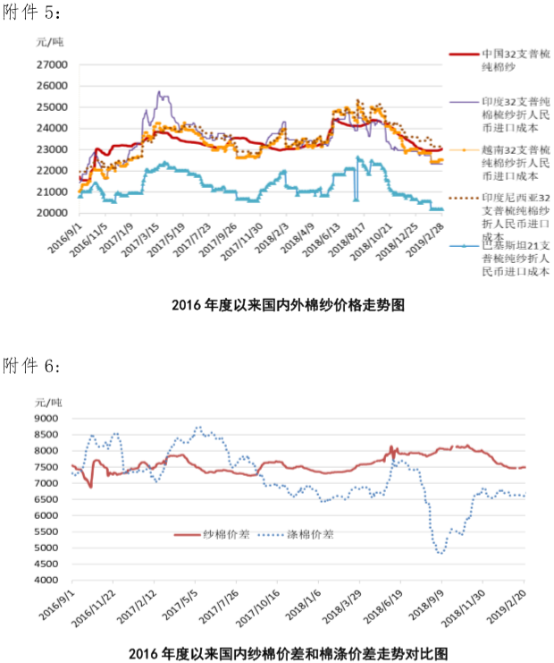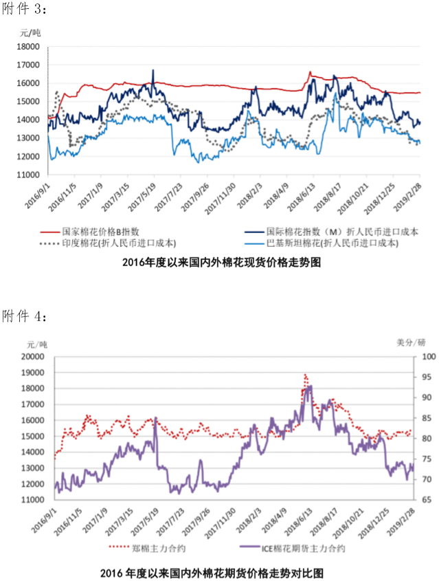 本周,特朗普推遲對中國加征關(guān)稅期限,國際市場避險情緒有所改善,提振國際棉價整體上漲。2019年2月25日-3月1日,紐約棉花期貨主力合約結(jié)算價73.85美分/磅,較上周上漲0.84美分/磅,漲幅1.15%,代表進(jìn)口棉中國主港到岸均價的國際棉花指數(shù)(M)81.21美分/磅,較上周上漲0.28美分/磅,漲幅0.34%,折人民幣進(jìn)口成本13847元/噸,較上周上漲44元/噸,漲幅0.32%;內(nèi)外棉價差1629元/噸,較上周縮小46元/噸。(詳見附件1)
