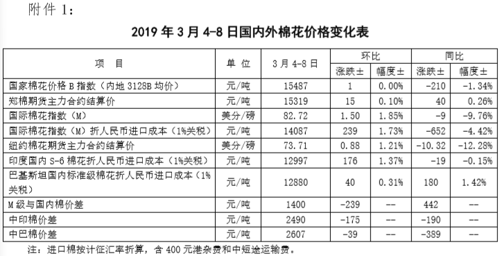 附件1:2019年3月4-8日國(guó)內(nèi)外棉花價(jià)格變化表