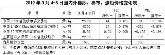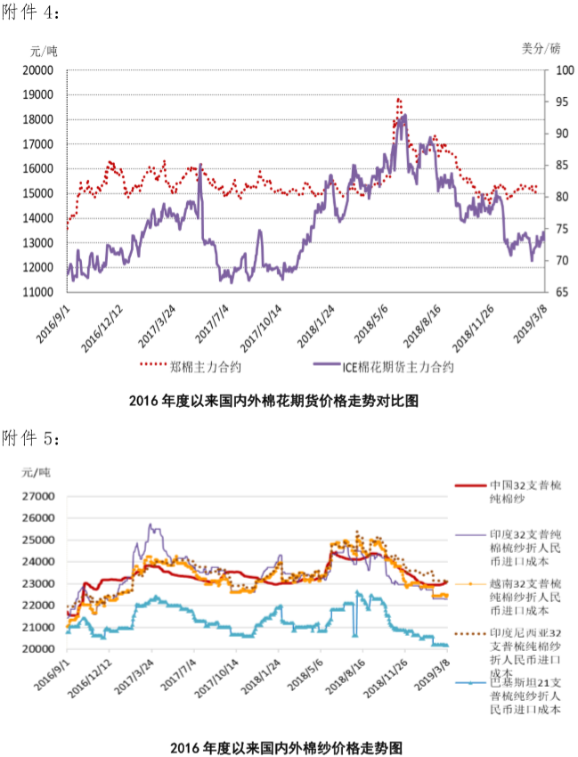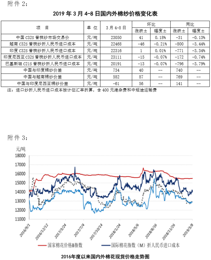 附件2:2019年3月4-8日國(guó)內(nèi)外棉紗價(jià)格變化表