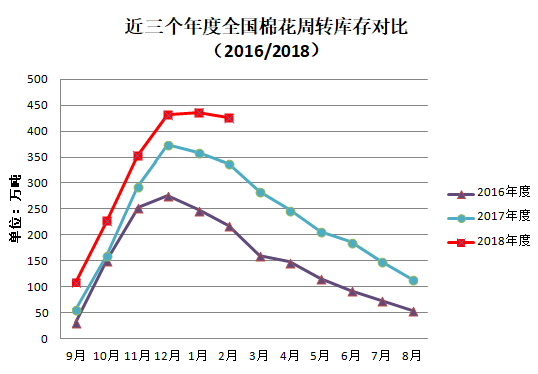 2月受春節(jié)放假影響,紡織企業(yè)實(shí)際采購和用棉量均環(huán)比下降,但由于新棉入市基本結(jié)束,月末全國棉花周轉(zhuǎn)庫存有所下降。據(jù)中國棉花協(xié)會棉花物流分會對全國18個省市的186家棉花交割和監(jiān)管倉庫調(diào)查數(shù)據(jù)顯示:2月底全國棉花周轉(zhuǎn)庫存426.08萬噸,較上月減少10.27萬噸,降幅2.4%,這是本年度以來周轉(zhuǎn)庫存首次下降。