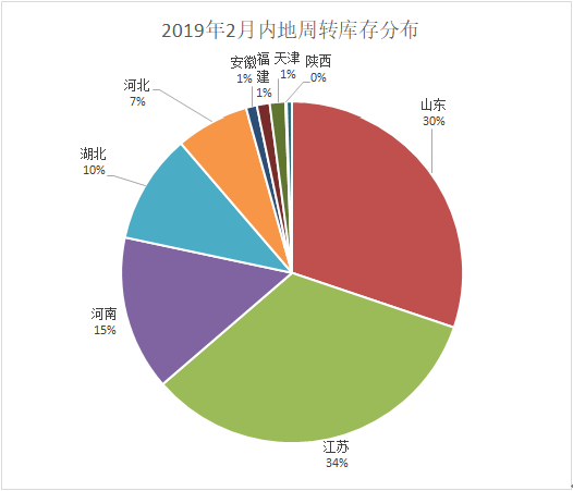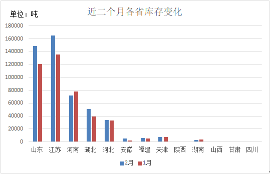 從各省庫存分布情況看:江蘇省庫存量最大16.49萬噸,山東省次之14.85萬噸,河南省居第三位7.21萬噸,湖北省5.11萬噸,河北省3.42萬噸,其他省在萬噸以下。
