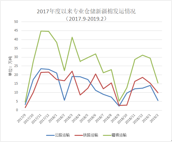 2018年9月-2019年2月出疆棉公路與鐵路共發(fā)運(yùn)122.70萬噸,同比減少59.87萬噸。