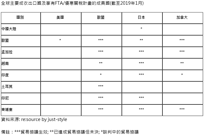 成衣企業(yè)普遍采用降低進(jìn)口稅成本的策略是自自由貿(mào)易協(xié)議(FTA)的成員國或享有貿(mào)易優(yōu)惠計(jì)劃【如普惠制, Generalized system of Preferences(GSP)】進(jìn)行采購。如下表所示,特別是位于歐盟和日本的成衣企業(yè)有很多機(jī)會(huì)自世界主要的免稅成衣生產(chǎn)據(jù)點(diǎn)進(jìn)行采購。相比之下,美國與一些主要的成衣出口國簽訂自由貿(mào)易協(xié)議和貿(mào)易優(yōu)惠計(jì)劃較少—這使得美國時(shí)尚品牌和零售商更難享受到貿(mào)易協(xié)議提供的優(yōu)惠關(guān)稅好處。