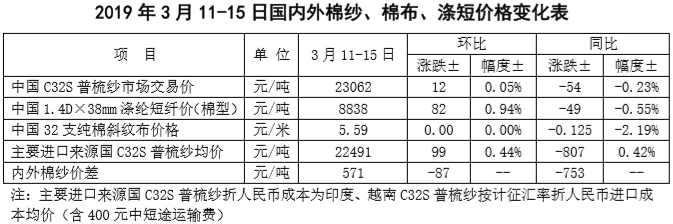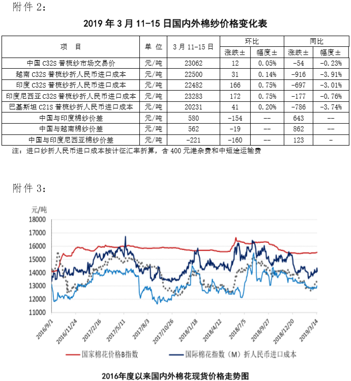 附件2:2019年3月11-15日國內(nèi)外棉紗價(jià)格變化表