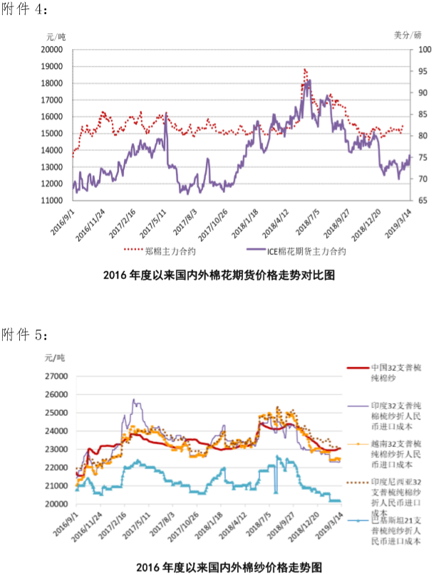 本周,美元指數(shù)創(chuàng)3個(gè)月來最大單周跌幅,商品市場(chǎng)反彈,國際棉花價(jià)格振蕩收漲。2019年3月11-15日,紐約棉花期貨主力合約結(jié)算價(jià)74.71美分/磅,較上周上漲1美分/磅,漲幅1.36%,代表進(jìn)口棉中國主港到岸均價(jià)的國際棉花指數(shù)(M)83.15美分/磅,較上周上漲0.43美分/磅,漲幅0.52%,折人民幣進(jìn)口成本14158元/噸,較上周上漲71元/噸,漲幅0.51%;內(nèi)外棉價(jià)差1362元/噸,較上周縮小38元/噸。(詳見附件1),