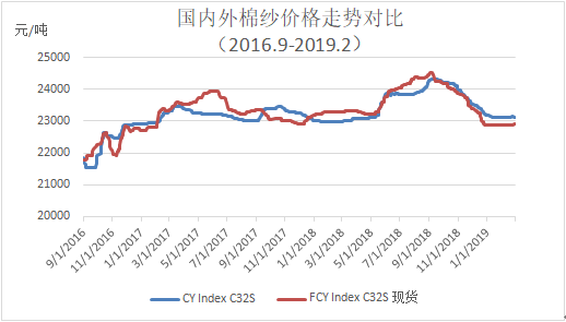 本月內(nèi)外棉紗價(jià)格與上月變化不大。據(jù)調(diào)查,國(guó)產(chǎn)32支純棉紗2月均價(jià)23135元/噸,較上月上漲2元/噸,基本持平,較去年同期上漲165元/噸,漲幅0.7%;進(jìn)口32支純棉紗月均價(jià)22890元/噸,較上月上升10元/噸,漲幅0.04%,較去年同期下跌415元/噸,跌幅1.78%。本月市場(chǎng)剛剛恢復(fù),紗廠庫(kù)存較年底前下降,對(duì)外報(bào)價(jià)基本維持穩(wěn)定,普遍多觀望心理。