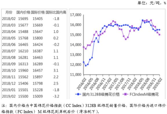 (三)國內(nèi)外棉價差繼續(xù)擴大。2月,CotlookA指數(shù)(相當于國內(nèi)3128B級棉花)折合人民幣每噸12096元,比中國棉花價格指數(shù)(CCIndex)3128B級每噸低3404元,價差比上月擴大397元。進口棉價格指數(shù)(FCIndex)M級(相當于國內(nèi)3128B級棉花)月均價每磅81.86美分,1%關稅下折到岸稅后價每噸13756元,比國內(nèi)價格低1744元,價差比上月擴大324元;滑準稅下折到岸稅后價每噸15009元,比國內(nèi)價格低491元,價差比上月擴大218元。