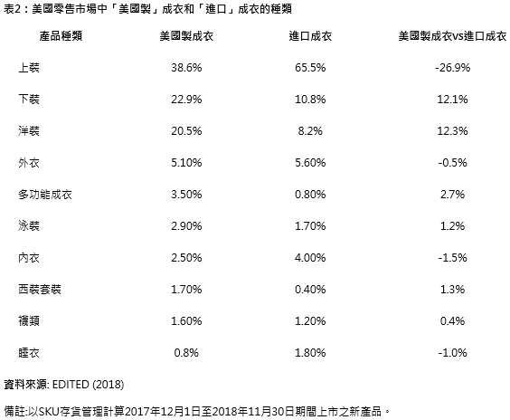 當(dāng)我們更詳細(xì)分析其產(chǎn)品類別時(shí),美國時(shí)尚品牌和零售商對(duì)于”美國制”成衣和”進(jìn)口”成衣采用截然不同的產(chǎn)品種類策略。
