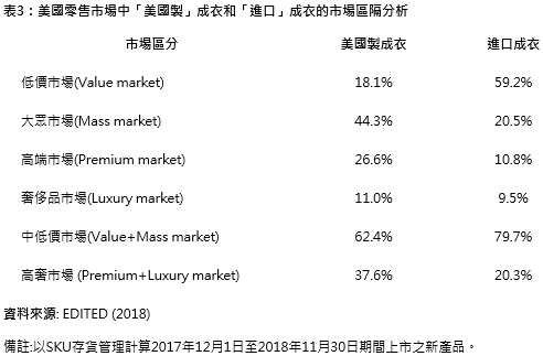 如表3所示,以美國整體成衣零售市場(chǎng)為例,針對(duì)高端成衣或奢侈品成衣市場(chǎng),”美國制”產(chǎn)品的占比接近40%,而進(jìn)口品僅占20%。相反地,”美國制”產(chǎn)品在低價(jià)市場(chǎng)中僅占18%,而進(jìn)口品在該市場(chǎng)約占60%??傮w而言,似乎美國時(shí)尚品牌和零售商有計(jì)劃性將”美國制”成衣定位于價(jià)格敏感度較低的市場(chǎng),以平衡高昂的國內(nèi)生產(chǎn)成本。