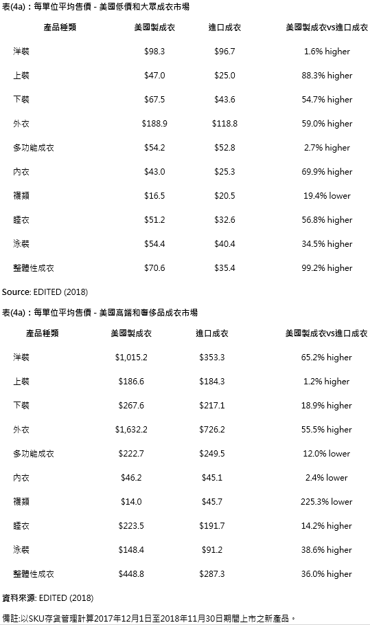 另一方面,在產(chǎn)品層面,除了襪類產(chǎn)品外,幾乎所有主要類別的”美國制”成衣價(jià)格仍高于進(jìn)口成衣(表4a和4b)。值得注意的是,在過去12個(gè)月中,在低價(jià)和大眾市場(chǎng)中的”美國制”成衣的每單位平均售價(jià)比進(jìn)口成衣高出99.2%;在高端和奢侈品市場(chǎng)則高出36%。此一有趣的現(xiàn)象支持”美國消費(fèi)者愿意為“美國制”卷標(biāo)的產(chǎn)品支付較高費(fèi)用”的論點(diǎn)。