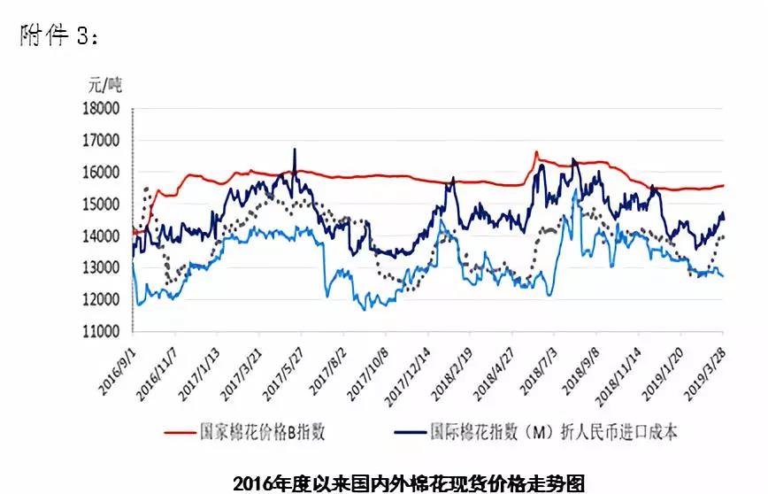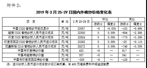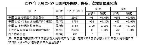 本周,美棉下年度意向種植面積不及預(yù)期,推動(dòng)國際棉價(jià)上漲。2019年3月25-29日紐約棉花期貨主力合約結(jié)算價(jià)77.21美分/磅,較上周上漲1.17美分/磅,漲幅1.54%,代表進(jìn)口棉中國主港到岸均價(jià)的國際棉花指數(shù)(M)為85.95美分/磅,較上周上漲1.53美分/磅,漲幅1.81%,折人民幣進(jìn)口成本14622元/噸,較上周上漲253元/噸,漲幅1.76%;內(nèi)外棉價(jià)差946元/噸,較上周縮小237元/噸。(詳見附件1),