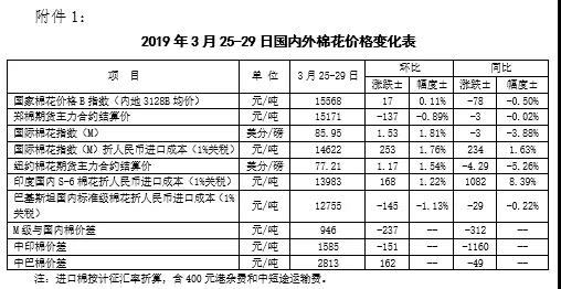 本周,棉花市場補(bǔ)庫緩慢進(jìn)行,皮棉現(xiàn)貨報(bào)價(jià)略顯堅(jiān)挺,下游棉紗訂單回暖乏力,拖累鄭棉期貨價(jià)格下跌。2019年3月25-29日,代表內(nèi)地標(biāo)準(zhǔn)級(jí)皮棉銷售均價(jià)的國家棉花價(jià)格B指數(shù)15568元/噸,較上周上漲17元/噸,漲幅0.11%,鄭州棉花期貨主力合約結(jié)算價(jià)15171元/噸,較上周下跌137元/噸,跌幅0.89%。