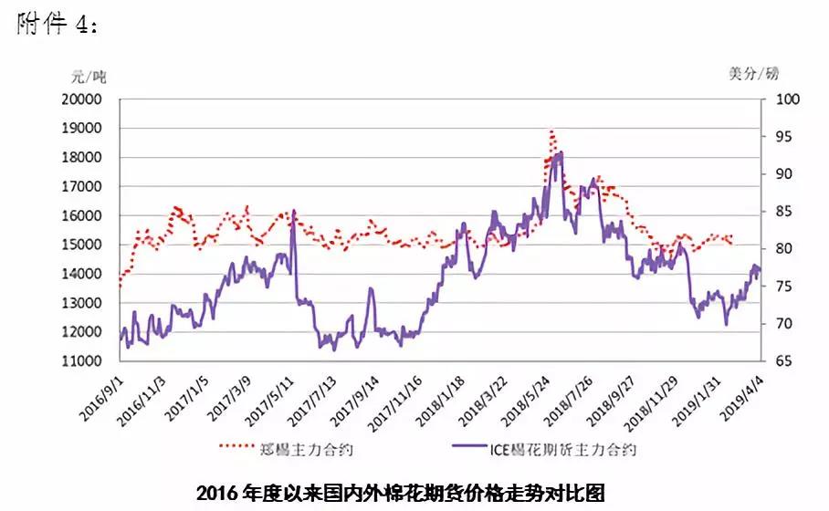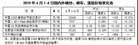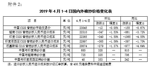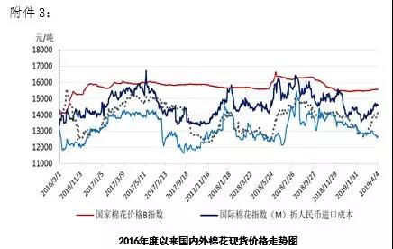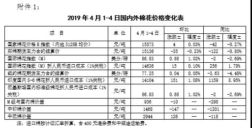 本周,全球股市上漲及美棉出口強(qiáng)勁,帶動(dòng)國(guó)際棉價(jià)繼續(xù)小幅上漲。2019年4月1-4日,紐約棉花期貨主力合約結(jié)算價(jià)77.25美分/磅,較上周上漲0.04美分/磅,漲幅0.05%,代表進(jìn)口棉中國(guó)主港到岸均價(jià)的國(guó)際棉花指數(shù)(M)86.83美分/磅,較上周上漲0.88美分/磅,漲幅1.02%,折人民幣進(jìn)口成本14636元/噸,較上周上漲15元/噸,漲幅0.1%;內(nèi)外棉價(jià)差936元/噸,較上周縮小10元/噸。(詳見(jiàn)附件1)