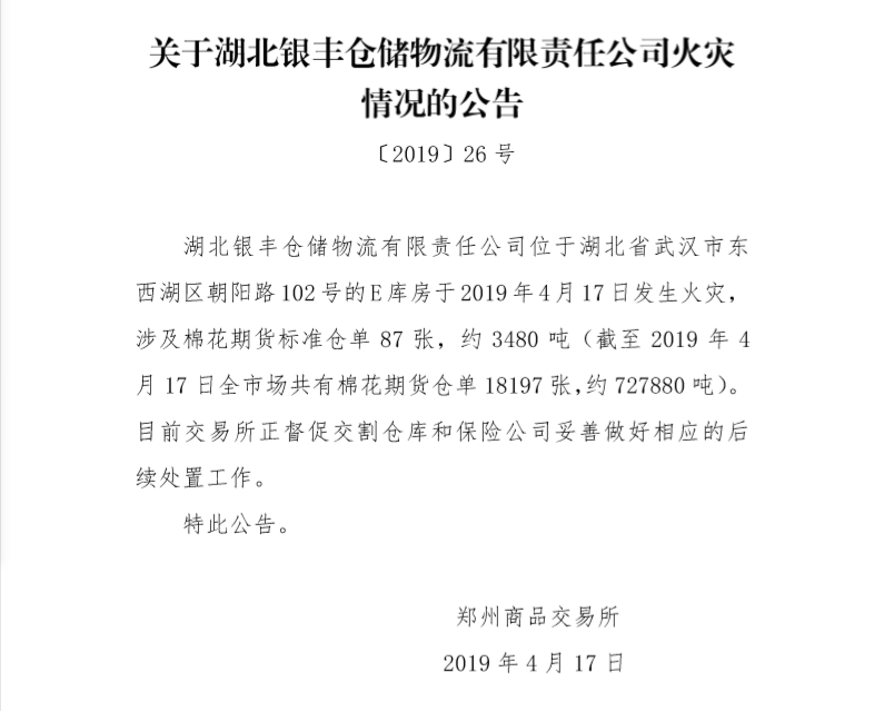 隨后鄭商所及時(shí)進(jìn)行信息披露,在其官網(wǎng)及對(duì)媒體發(fā)布公告稱,湖北銀豐倉儲(chǔ)物流有限責(zé)任公司位于湖北省武漢市東西湖區(qū)朝陽路102號(hào)的E庫房于2019年4月17日發(fā)生火災(zāi),涉及棉花期貨標(biāo)準(zhǔn)倉單87張,約3480噸。