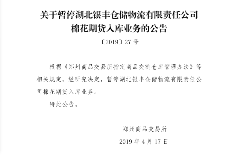 鄭商所公告表示目前正督促交割倉庫和保險(xiǎn)公司妥善做好相應(yīng)后續(xù)處置工作。同時(shí)將暫停湖北銀豐倉儲(chǔ)物流有限責(zé)任公司棉花期貨入庫業(yè)務(wù)。