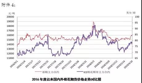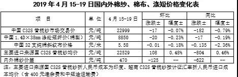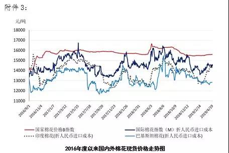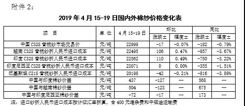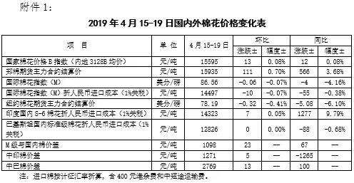 本周,受美元指數(shù)回升和美棉出口量下降影響,國際棉價(jià)略有下跌。2019年4月15-19日,紐約棉花期貨主力合約結(jié)算價(jià)78.19美分/磅,較上周下跌0.32美分/磅,跌幅0.41%,代表進(jìn)口棉中國主港到岸均價(jià)的國際棉花指數(shù)(M)為86.56美分/磅,較上周下跌0.06美分/磅,跌幅0.07%,折人民幣進(jìn)口成本14497元/噸,較上周下跌10元/噸,跌幅0.07%;內(nèi)外棉價(jià)差1098元/噸,較上周擴(kuò)大23元/噸。(詳見附件1)。