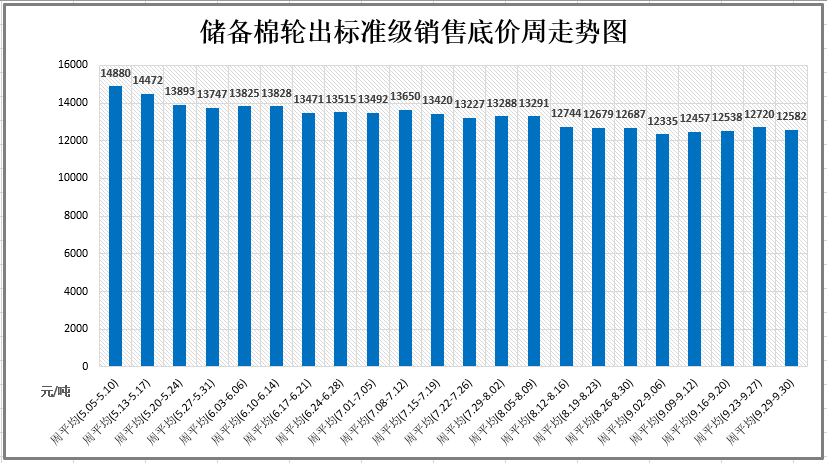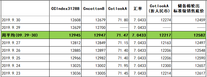 根據國家糧食和物資儲備局、財政部公告(2019年第1號)對中央儲備棉輪出銷售底價計算公式,第22周(9月29-30日)標準級銷售底價12582元/噸,較上周下調138元/噸;每日上市實際批次儲備棉銷售底價,以標準級銷售底價為依據,按棉花公證檢驗結果及中國棉花協(xié)會公布的有關質量差價表計算確定。2019年9月中棉協(xié)《國產棉質量差價表》