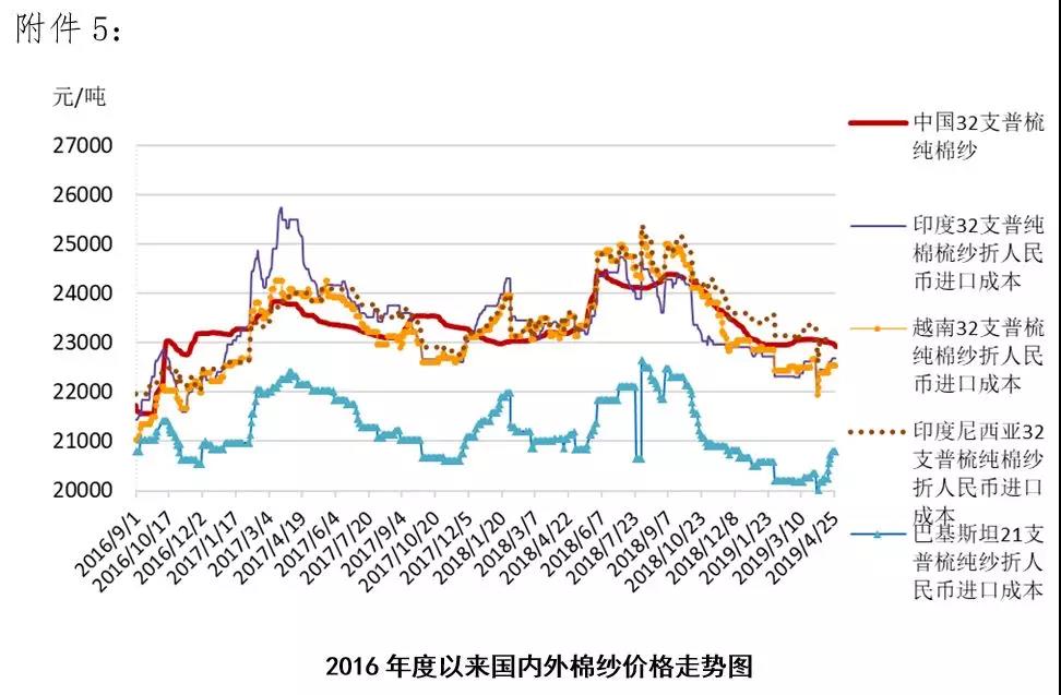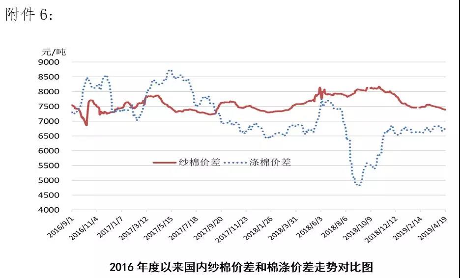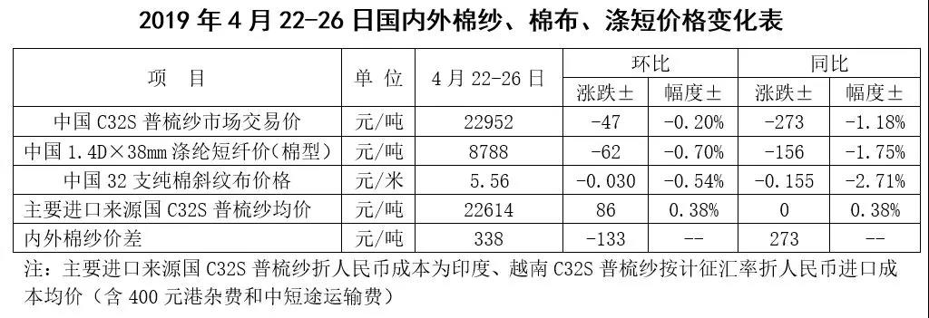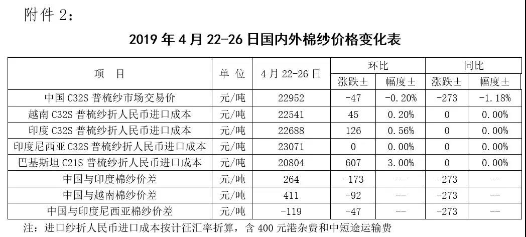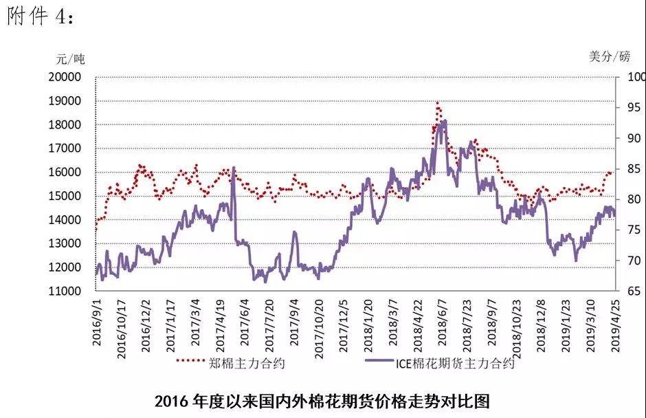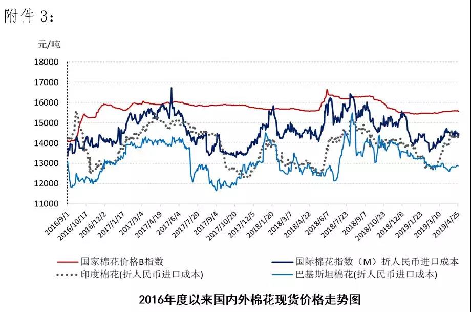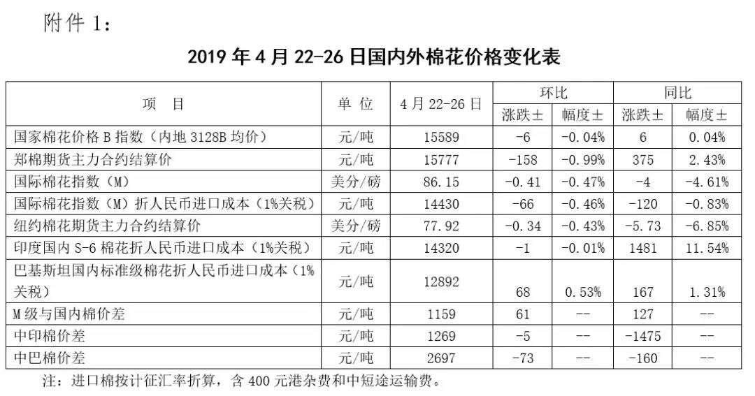 本周,受中國儲備棉輪出政策、美元指數(shù)大漲、美國得州降雨改善播種條件等因素影響,國際棉價振蕩下跌。2019年4月22-26日紐約棉花期貨主力合約結(jié)算價77.92美分/磅,較上周下跌0.34美分/磅,跌幅0.43%,代表進口棉中國主港到岸均價的國際棉花指數(shù)(M)86.15美分/磅,較上周下跌0.41美分/磅,跌幅0.47%,折人民幣進口成本14430元/噸,較上周下跌66元/噸,跌幅0.46%;內(nèi)外棉價差1598元/噸,較上周擴大61元/噸。(詳見附件1)。