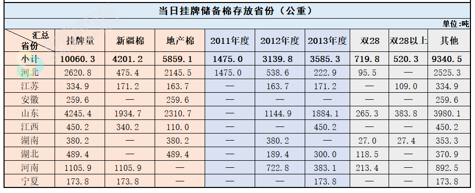 2.當日輪出上市儲備棉中有部分為分批抽樣公檢。抽樣比率及抽樣方法按照棉花國家標準規(guī)定,品質(zhì)指標包括顏色級、軋工質(zhì)量、長度、馬克隆值、斷裂比強度、長度整齊度指標;重量采用原入庫公檢結(jié)果,不再重新檢驗。