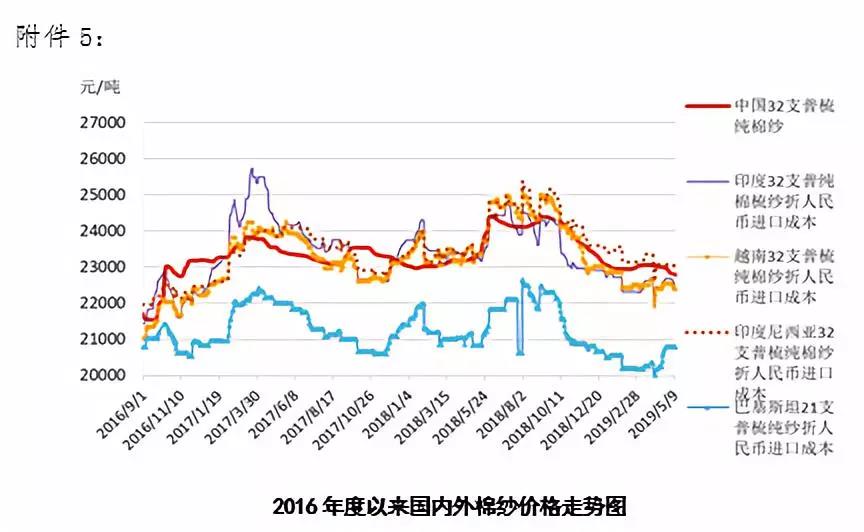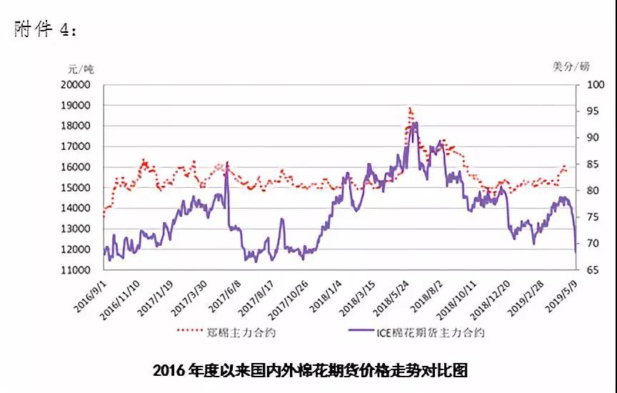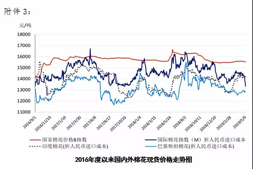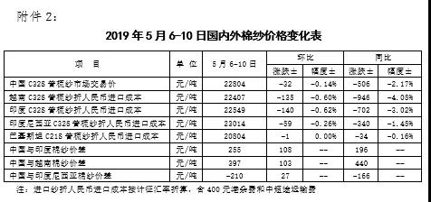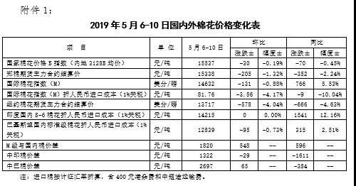 本周,美對華加征關(guān)稅,全球貿(mào)易的擔(dān)憂情緒升溫,導(dǎo)致國際棉價(jià)跌幅加大。2019年5月6-10日,紐約棉花期貨主力合約結(jié)算價(jià)71.54美分/磅,較上周下跌4.77美分/磅,跌幅6.25%,代表進(jìn)口棉中國主港到岸均價(jià)的國際棉花指數(shù)(M)為81.76美分/磅,較上周下跌3.56美分/磅,跌幅4.17%,折人民幣進(jìn)口成本13717元/噸,較上周下跌578元/噸,跌幅4.04%;內(nèi)外棉價(jià)差1820元/噸,較上周擴(kuò)大548元/噸。(詳見附件1)