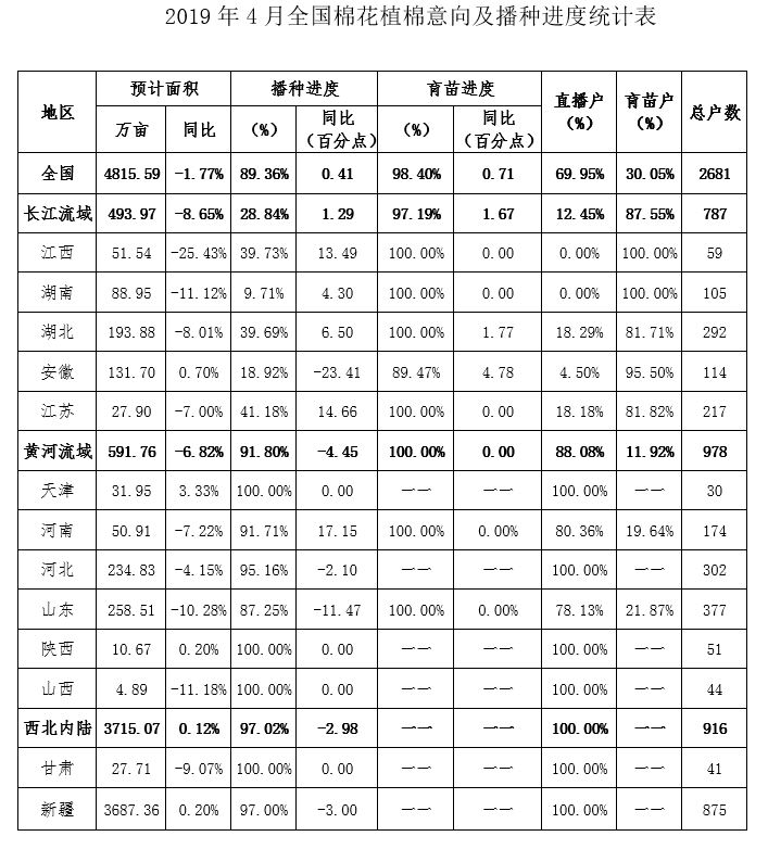 2019年4月,中國(guó)棉花協(xié)會(huì)棉農(nóng)分會(huì)對(duì)全國(guó)12個(gè)省和新疆自治區(qū)共2681個(gè)定點(diǎn)農(nóng)戶(hù)進(jìn)行第四次2019年植棉意向調(diào)查。結(jié)果顯示:全國(guó)植棉意向面積4815.59萬(wàn)畝,同比下降1.77%,較上期回升1.58個(gè)百分點(diǎn)。其中新疆棉農(nóng)種植意向同比上漲0.2%,較上期回升2.1個(gè)百分點(diǎn);黃河流域、長(zhǎng)江流域同比下降分別6.82%、8.65%,均與上期預(yù)測(cè)持平。