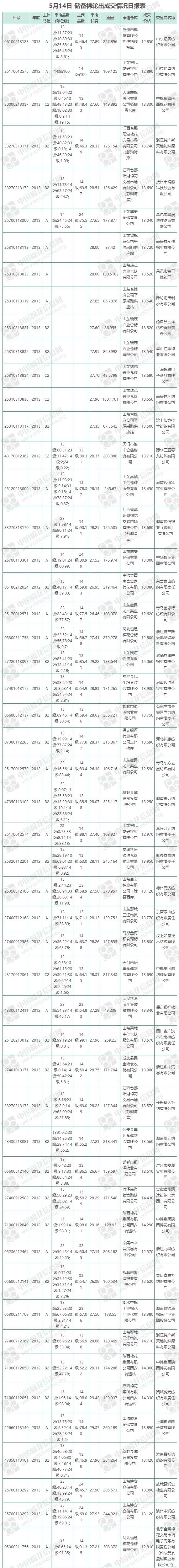 5月14日儲備棉輪出銷售資源11618.185噸,實(shí)際成交8883.6501噸,成交率76.46%。平均成交價(jià)格13443元/噸,較13日下跌534元/噸;折3128價(jià)格14838元/噸,較13日下跌459元/噸。
