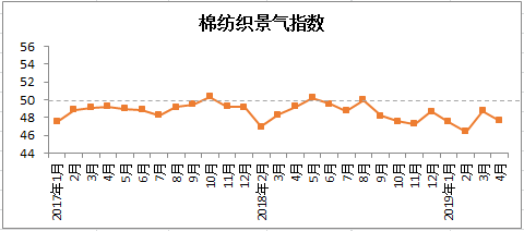 2019年4月中國棉紡織景氣指數(shù)47.63,與3月相比下降1.1。4月,國家發(fā)改委釋放2019年增發(fā)80萬噸滑準稅配額政策信號,儲備棉輪出政策公布,在市場持續(xù)低迷的情況下,棉花供應(yīng)呈現(xiàn)階段性供大于需,巴基斯坦棉紗將取消關(guān)稅的信息,進一步打擊了國內(nèi)中低支紗生產(chǎn)企業(yè)的經(jīng)營信心。受宏觀經(jīng)濟環(huán)境影響,終端紡織品消費下降,并快速向產(chǎn)業(yè)鏈上游傳導,本應(yīng)為傳統(tǒng)紡織的旺季,今年持續(xù)時間較短,市場交易較為清淡,紡企長訂單大幅減少,價格下行,產(chǎn)品庫存逐漸積累,部分紡織企業(yè)降價止損但仍難拋貨,悲觀情緒加重。5月,中美貿(mào)易摩擦再度升級,宏觀經(jīng)濟下行風險加大,原料、產(chǎn)品價格均繼續(xù)呈下跌態(tài)勢,行情走淡明顯,預(yù)計5月行業(yè)景氣指數(shù)繼續(xù)回落,部分紡企呼吁國家收儲以短期內(nèi)支持價格穩(wěn)定。