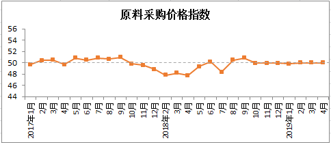 4月原料采購價格指數(shù)50.02,與3月相比增加0.02。4月初,全球股市上漲,市場基本面逐步好轉(zhuǎn),國內(nèi)外棉花價格有所回升,4月下旬,儲備棉輪出政策公布,紡企觀望并等待5月份的儲備棉拋儲,棉花價格小幅回落。4月,CotlookA指數(shù)平均值87.35美分/磅,環(huán)比增加3.54美分/磅;國內(nèi)3128B級棉花現(xiàn)貨均價為15455元/噸,環(huán)比增加133元/噸。4月粘膠行業(yè)部分企業(yè)進行例行檢修,行業(yè)負荷小幅波動,企業(yè)有意上調(diào)報價,但下游接受度不高。滌綸短纖價格呈先漲后跌態(tài)勢,但整體變化不大。4月,主流粘膠纖維均價為12542元/噸,環(huán)比下降106元/噸;1.4D直紡滌短均價為8813元/噸,環(huán)比下降30元/噸。5月中美貿(mào)易摩擦再生端倪,棉花期貨價格幾度跌停,化纖短纖價格跌幅加深,預(yù)計5月原料采購價格指數(shù)有所下降。