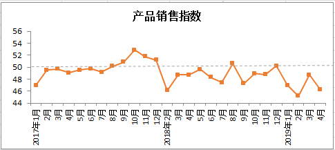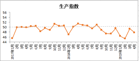 4月生產(chǎn)指數(shù)47.81,與3月相比下降1.53。4月,市場行情逐漸走淡,企業(yè)生產(chǎn)接單較去年有所下降。調(diào)研了解,紡紗廠開工正常,開臺率基本保持95%以上,個別企業(yè)由于產(chǎn)品調(diào)整,關(guān)停部分細紗車。走訪企業(yè)普遍反映,中美貿(mào)易摩擦對紡織行業(yè)的影響逐漸顯現(xiàn),企業(yè)接單量逐漸減少甚至無單可接,放緩生產(chǎn)已是無奈之舉。跟蹤企業(yè)數(shù)據(jù)顯示,4月紗產(chǎn)量環(huán)比下降3.44%,布產(chǎn)量環(huán)比下降0.58%。其中,棉混紡紗和棉混紡布產(chǎn)量下降較為明顯,棉混紡紗產(chǎn)量環(huán)比下降6.77%,棉混紡布產(chǎn)量環(huán)比下降9.02%。5月,企業(yè)接單一般,部分企業(yè)五一假期延長,預(yù)計生產(chǎn)指數(shù)繼續(xù)下降。