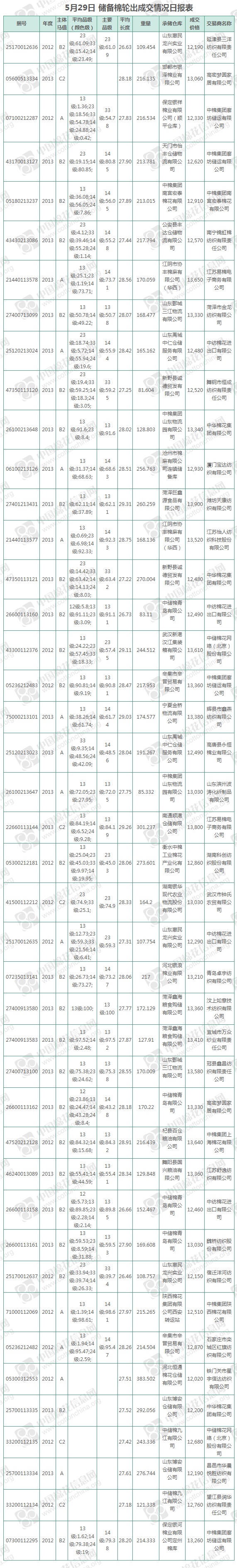 5月29日儲備棉輪出銷售資源9831.9835噸,實際成交8294.988噸,成交率84.37%,成交均價12932元/噸,較28日上漲23元/噸;折3128價格14280元/噸,較28日上漲38元/噸。