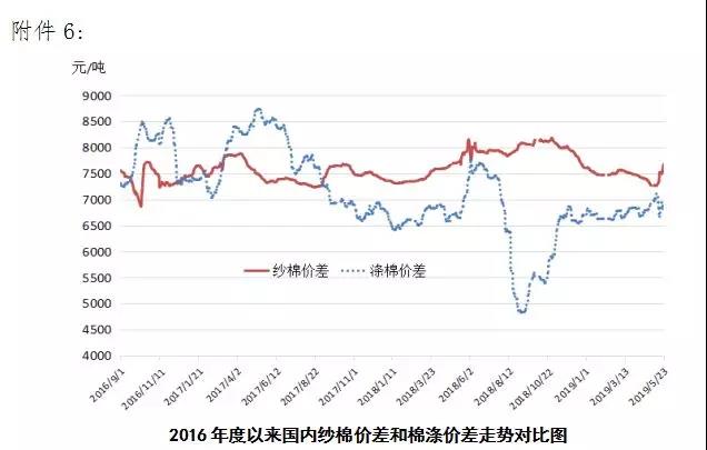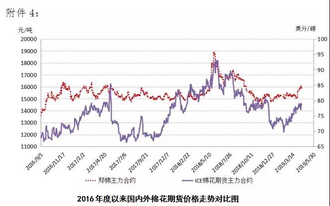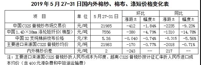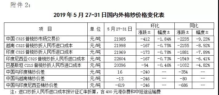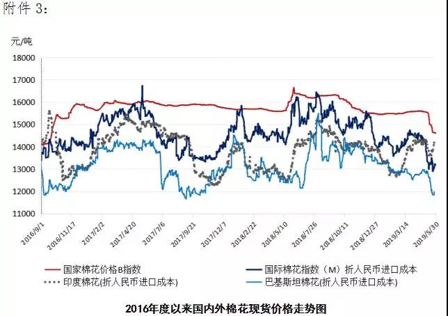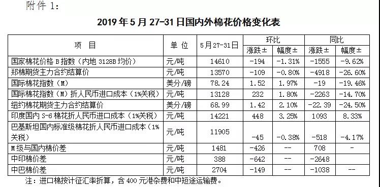 本周,受美國棉區(qū)干濕不均天氣及美國谷物漲勢提振,國際棉價整體有所上漲。2019年5月27-31日,紐約棉花期貨主力合約結(jié)算價68.99美分/磅,較上周上漲1.42美分/磅,漲幅2.1%,代表進(jìn)口棉中國主港到岸均價的國際棉花指數(shù)(M)78.24美分/磅,較上周上漲1.52美分/磅,漲幅1.97%,折人民幣進(jìn)口成本13128元/噸,較上周上漲232元/噸,漲幅1.8%;內(nèi)外棉價差1481元/噸,較上周縮小426元/噸。(詳見附件1)