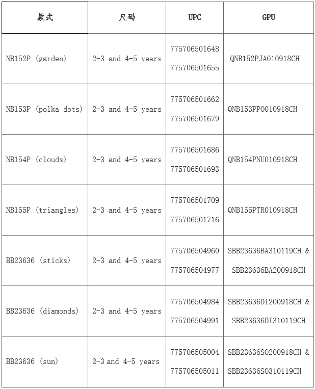 此次召回產(chǎn)品為PerlimpinpinInc.的兩款睡袋款兒童睡衣。一款外層由100%聚酯纖維制成,雙層內(nèi)襯由65%聚酯纖維和35%棉制成。另一款由70%竹制人造絲和30%棉制成。具體召回產(chǎn)品信息如下: