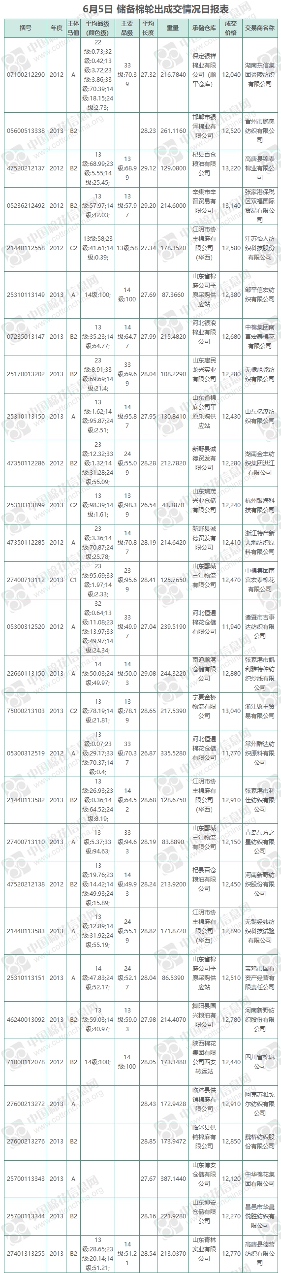 新疆棉成交均價(jià)12675元/噸,新疆棉折3128價(jià)格13954元/噸,新疆棉加價(jià)幅度129元/噸。