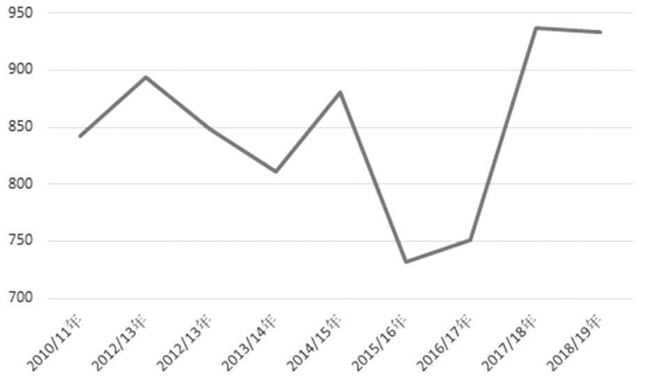 圖為國際市場棉花年度期末庫存(單位:萬噸)