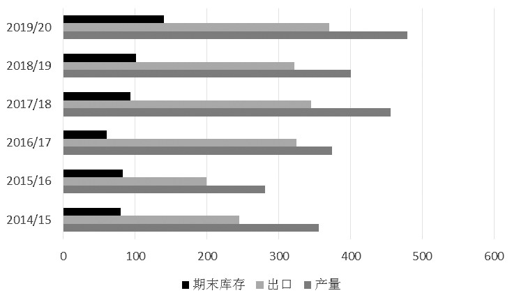 圖為美棉產(chǎn)量、出口量及期末庫存(單位:萬噸)