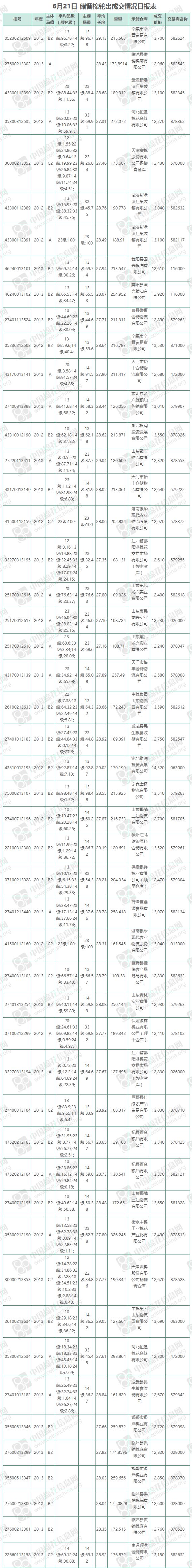 6月21日儲(chǔ)備棉輪出銷售資源9943.2449噸,實(shí)際成交9332.9368噸,成交率93.86%,成交均價(jià)12911元/噸,較20日下跌36元/噸;折3128價(jià)格14050元/噸,較20日下跌124元/噸。
