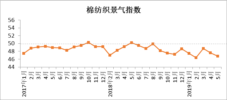 2019年5月中國棉紡織景氣指數(shù)46.82,與4月相比下降0.81。5月,儲備棉輪出正式開始,由于前期市場等待拋儲,部分紡中低支紗企業(yè)原料庫存處于低位,因此儲備棉輪出首周成交率高企。5月8日,中美貿易摩擦再度升級,市場觀望情緒從終端不斷向上游傳導,產(chǎn)業(yè)鏈各環(huán)節(jié)企業(yè)均不敢下單,導致市場供大于求,原料、產(chǎn)品價格不斷下跌,企業(yè)庫存增加,市場活力下降,企業(yè)家經(jīng)營信心受到?jīng)_擊,行業(yè)景氣度下滑。6月,下游市場并無明顯改善,美國擬對3000億美元中國輸美產(chǎn)品征加關稅聽證會以及G20峰會中美雙方領導談判結果成為行業(yè)關注的焦點。因此,在沒有相關利好消息公布前,預計行業(yè)景氣度依然不高。