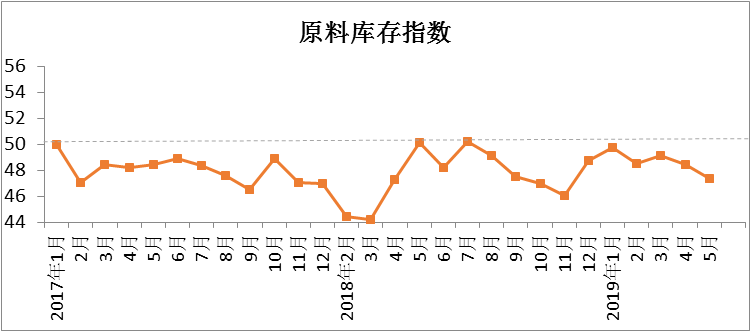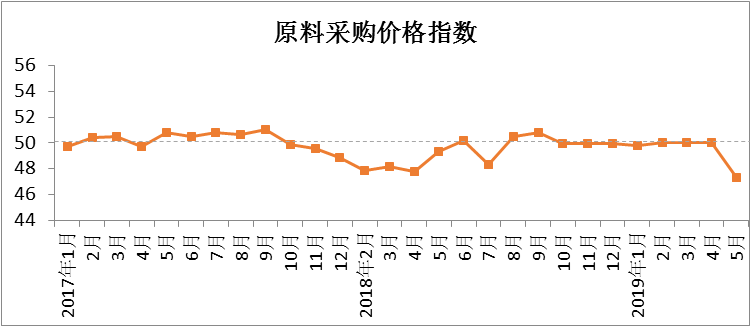 5月原料采購價格指數(shù)47.3,與4月相比下降2.72。5月初,國內外棉花價格弱勢平穩(wěn),5月8日,美國單方面宣布,擬于5月10日將對2000億美元中國輸美商品加征的關稅從10%上調至25%,引起市場波動,國內外棉花期貨多次跌停,現(xiàn)貨價格隨之下跌。5月,CotlookA指數(shù)平均值80.14美分/磅,環(huán)比下降7.21美分/磅;國內3128B級棉花現(xiàn)貨均價為14770元/噸,環(huán)比下降685元/噸。由于下游市場持續(xù)低迷,化纖短纖價格一直維持小幅下跌態(tài)勢,中美貿易摩擦的再度升級引起市場擔憂情緒升溫,價格跌幅加深。5月,主流粘膠纖維均價為11950元/噸,環(huán)比下降592元/噸;1.4D直紡滌短均價為8112元/噸,環(huán)比下降701元/噸。6月,原料價格繼續(xù)維持下跌,雖然近期滌綸短纖價格有回升趨勢,但仍不能改變市場大環(huán)境,預計6月原料采購價格指數(shù)繼續(xù)下降。