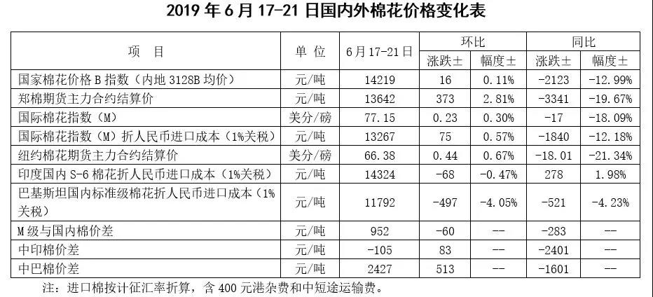 本周,中美貿(mào)易釋放有利信號(hào),國(guó)內(nèi)棉價(jià)隨之上漲。2019年6月17-21日,代表內(nèi)地標(biāo)準(zhǔn)級(jí)皮棉銷售均價(jià)的國(guó)家棉花價(jià)格B指數(shù)14219元/噸,較上周上漲16元/噸,漲幅0.11%;鄭州棉花期貨主力合約結(jié)算均價(jià)13642元/噸,較上周上漲373元/噸,漲幅2.81%;儲(chǔ)備棉輪出成交均價(jià)12842元/噸,較上周上漲117元/噸,漲幅0.92%。