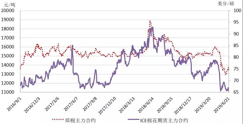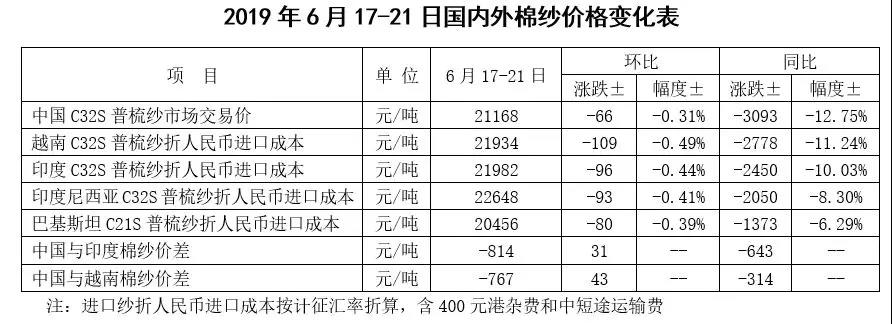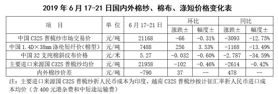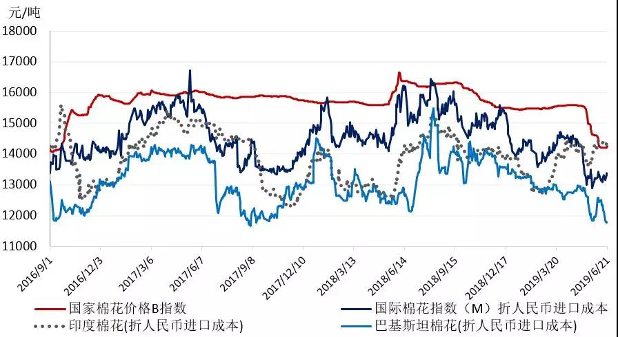 本周,受全球貨幣寬松預(yù)期升溫和中美貿(mào)易利好消息,以及美棉銷售下滑等利空影響,國(guó)際先漲后跌,整體有所上漲。2019年6月17-21日,紐約棉花期貨主力合約結(jié)算價(jià)66.38美分/磅,較上周上漲0.44美分/磅,漲幅0.67%,代表進(jìn)口棉中國(guó)主港到岸均價(jià)的國(guó)際棉花指數(shù)(M)77.15美分/磅,較上周上漲0.23美分/磅,漲幅0.3%,折人民幣進(jìn)口成本13267元/噸,較上周上漲75元/噸,漲幅0.57%;內(nèi)外棉價(jià)差952元/噸,較上周縮小60元/噸。(詳見附件1)