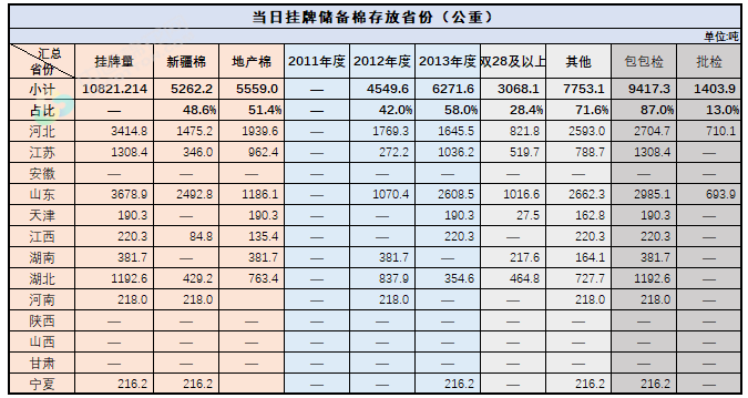 2.當日輪出上市儲備棉中有部分為分批抽樣公檢。抽樣比率及抽樣方法按照棉花國家標準規(guī)定,品質(zhì)指標包括顏色級、軋工質(zhì)量、長度、馬克隆值、斷裂比強度、長度整齊度指標;重量采用原入庫公檢結(jié)果,不再重新檢驗。