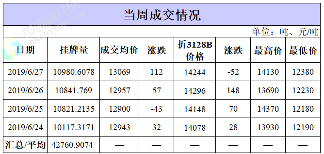 截至6月27日累計輪出銷售資源40.37萬噸,成交最高價15930元/噸,成交最低價11530元/噸。