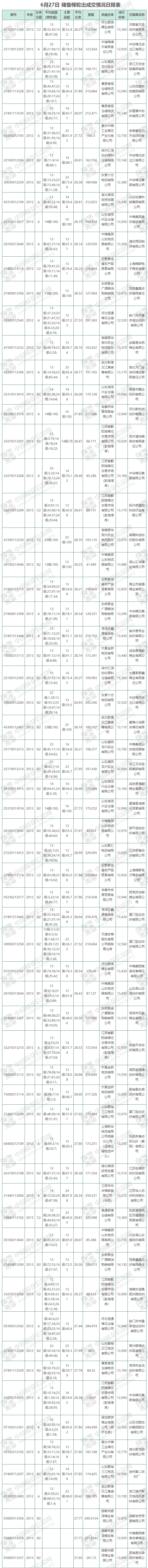 6月27日儲備棉輪出銷售資源10980.6078噸,實際成交10844.1317噸,成交率98.76%。平均成交價格13069元/噸,較26日上漲112元/噸;折3128價格14244元/噸,較26日下跌52元/噸。