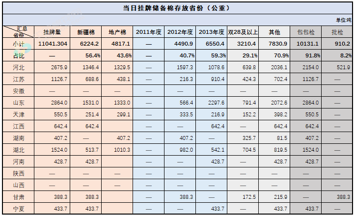 2.當日輪出上市儲備棉中有部分為分批抽樣公檢。抽樣比率及抽樣方法按照棉花國家標準規(guī)定,品質(zhì)指標包括顏色級、軋工質(zhì)量、長度、馬克隆值、斷裂比強度、長度整齊度指標;重量采用原入庫公檢結(jié)果,不再重新檢驗。
