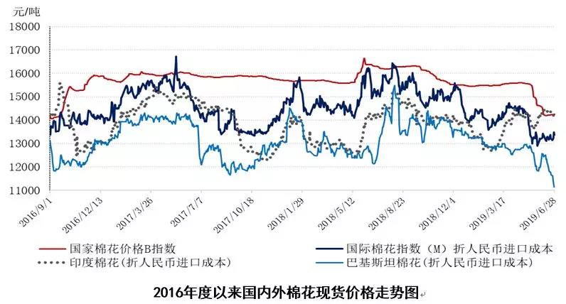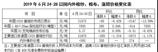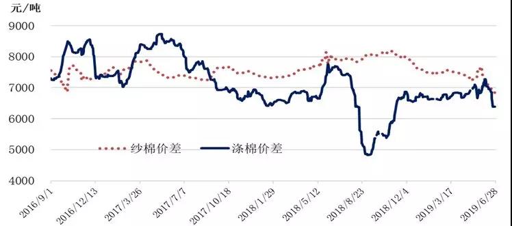 國(guó)內(nèi)棉花市場(chǎng)繼續(xù)觀望。2019年6月,中國(guó)制造業(yè)采購(gòu)經(jīng)理指數(shù)(PMI)為49.6%,與上月持平。外貿(mào)壓力疊加國(guó)內(nèi)需求疲弱態(tài)勢(shì),國(guó)內(nèi)經(jīng)濟(jì)可能繼續(xù)承壓,穩(wěn)增長(zhǎng)政策有可能進(jìn)一步加碼。根據(jù)國(guó)務(wù)院已公布的計(jì)劃,自7月1日起,減免不動(dòng)產(chǎn)登記費(fèi)等一批新的降費(fèi)措施將生效,預(yù)計(jì)實(shí)施后全年可為企業(yè)和群眾減負(fù)3000億元以上。國(guó)內(nèi)棉花市場(chǎng)方面,截至6月28日,全國(guó)新棉銷售進(jìn)度為73.1%,同比下降9個(gè)百分點(diǎn),其中新疆棉銷售進(jìn)度71.2%,全國(guó)尚有約165噸新棉未銷售;鄭棉期貨倉(cāng)單較上周繼續(xù)減少約2.4萬(wàn)噸至66.08萬(wàn)噸;儲(chǔ)備棉繼續(xù)每日掛牌約1萬(wàn)噸,加上滑準(zhǔn)稅配額下放,國(guó)內(nèi)供應(yīng)端整體仍顯充裕。近期下游悲觀情緒略有改善,但產(chǎn)成品走貨分化,棉紗價(jià)格并未跟隨棉價(jià)上漲,企業(yè)謹(jǐn)慎生產(chǎn)心態(tài)延續(xù),整個(gè)產(chǎn)業(yè)鏈各方都處于積極去庫(kù)存階段。當(dāng)前中美貿(mào)易重啟,市場(chǎng)期待局勢(shì)轉(zhuǎn)暖,但貿(mào)易勢(shì)態(tài)的發(fā)展具有不確定性,市場(chǎng)觀望氣氛仍未消散。面對(duì)中美貿(mào)易反復(fù)和持久性,企業(yè)需多措施應(yīng)對(duì)貿(mào)易摩擦的常態(tài)化,短期關(guān)注后續(xù)訂單變化。