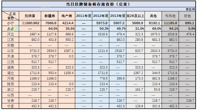 2.當日輪出上市儲備棉中有部分為分批抽樣公檢。抽樣比率及抽樣方法按照棉花國家標準規(guī)定,品質(zhì)指標包括顏色級、軋工質(zhì)量、長度、馬克隆值、斷裂比強度、長度整齊度指標;重量采用原入庫公檢結(jié)果,不再重新檢驗。