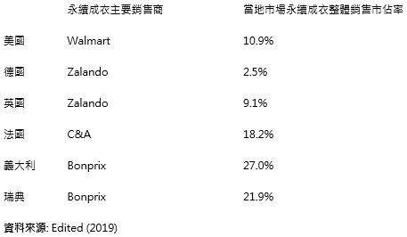 此外雖大家都普遍認(rèn)為規(guī)模較大的企業(yè)通常擁有更多資源來促進(jìn)永續(xù)性發(fā)展,但結(jié)果顯示,中小型(SME)時裝零售商對銷售永續(xù)成衣展現(xiàn)更大的熱情。有趣的是,我們檢視多數(shù)市場販賣永續(xù)成衣的主要銷售商,大都是中小規(guī)模的零售商,而不是知名的大型零售商(表2)。唯一的例外是美國和法國,Walmart和C&A分別排名第一。