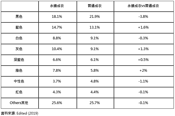 表5:永續(xù)成衣與普通成衣的顏色組合(2016-2018)