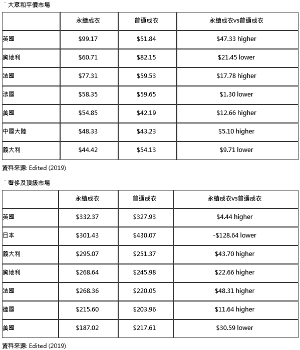 表6:永續(xù)成衣與普通成衣的平均零售價格