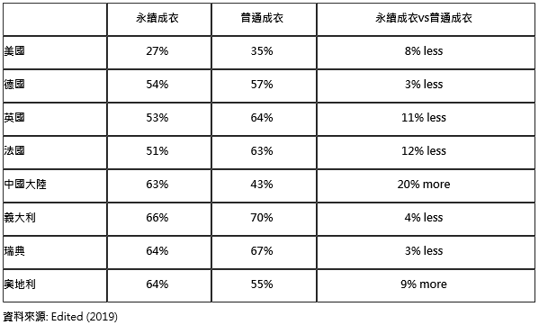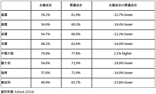 如表1所示,按銷售的庫存數(shù)量(SKUs)計算,美國、德國、英國、法國、中國和意大利是全球主要永續(xù)成衣的市場。值得注意的是,除中國外,所有的主要市場皆是已開發(fā)國家,尤其是美國和西歐題-這表明消費者的購買力與永續(xù)成衣產(chǎn)品需求之間存有密切的關(guān)系。